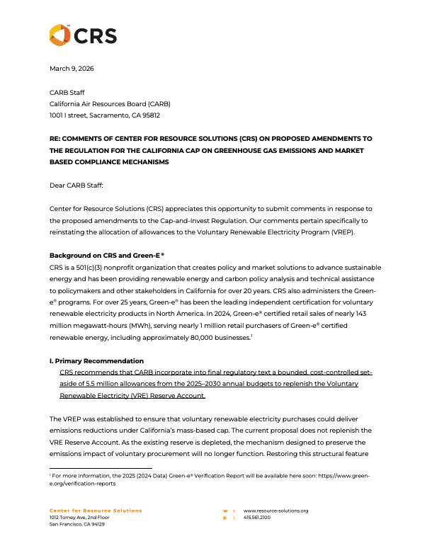 Center for Resource Solutions (CRS) urges the California Air Resources Board (CARB) to restore the Voluntary Renewable Electricity Program (VREP) by setting aside 5.5 million allowances for 2025–2030. Without this, voluntary renewable energy purchases will no longer reduce overall emissions under the cap, undermining their integrity. This limited, cost-controlled set-aside preserves environmental impact without harming …