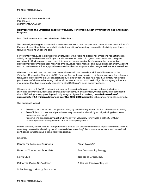 This letter urges the California Air Resources Board (CARB) to amend proposed cap-and-trade rules. Without changes, voluntary renewable energy purchases will no longer reduce overall emissions. The signatories recommend a small, limited allowance set-aside (5.5 million credits through 2030) to preserve the environmental integrity and credibility of voluntary green power investments.